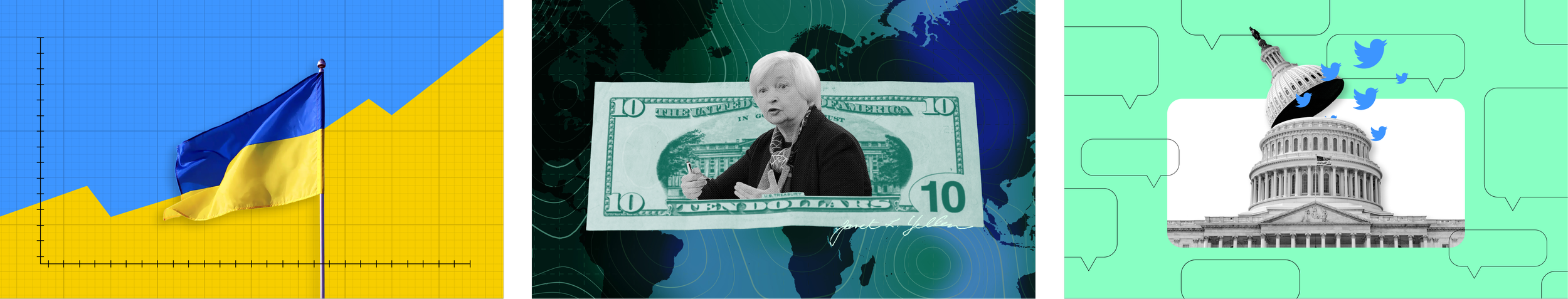 Middle: a digital collage of Secretary of the Treasury Janet L. Yellen on a piece of U.S. currency with a topographic background for an article about the Biden administration’s actions around the Green Climate Fund and other ESG initiatives